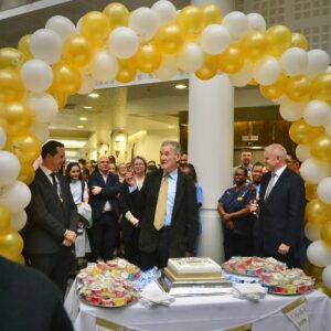 The 900th anniversary of St Bartholomew’s Hospital was celebrated, firstly with a cake-cutting November 2022 visit to the Great Hall by HRH King Charles III and then on March 24th 2023 in the Atrium of the KGV Building, with guest of honour Sir Michael Palin. Sir Michael (pictured) expressed his thanks to Barts for the treatment he had received at the hospital, saying that Barts would always be in his heart – “especially in the aortic artery!” The next day, the actual anniversary of the foundation of the Priory Church of St Bartholomew the Great – the beginning of Barts – was celebrated with a service of thanksgiving. The Guild held its own party to celebrate the 900th in the Princess Alice Garden, with HRH The Duke of Gloucester in attendance once again.